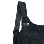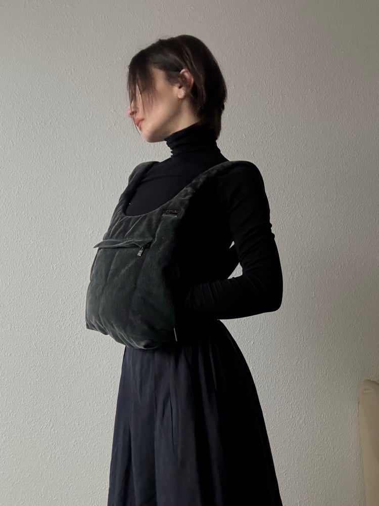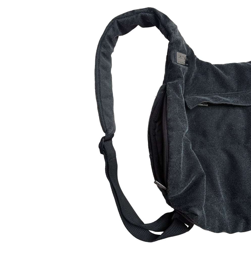 A dark grey furry circular backpack with zippers on both sides for easy access. The straps have some scuffs as seen in the third slide.
