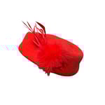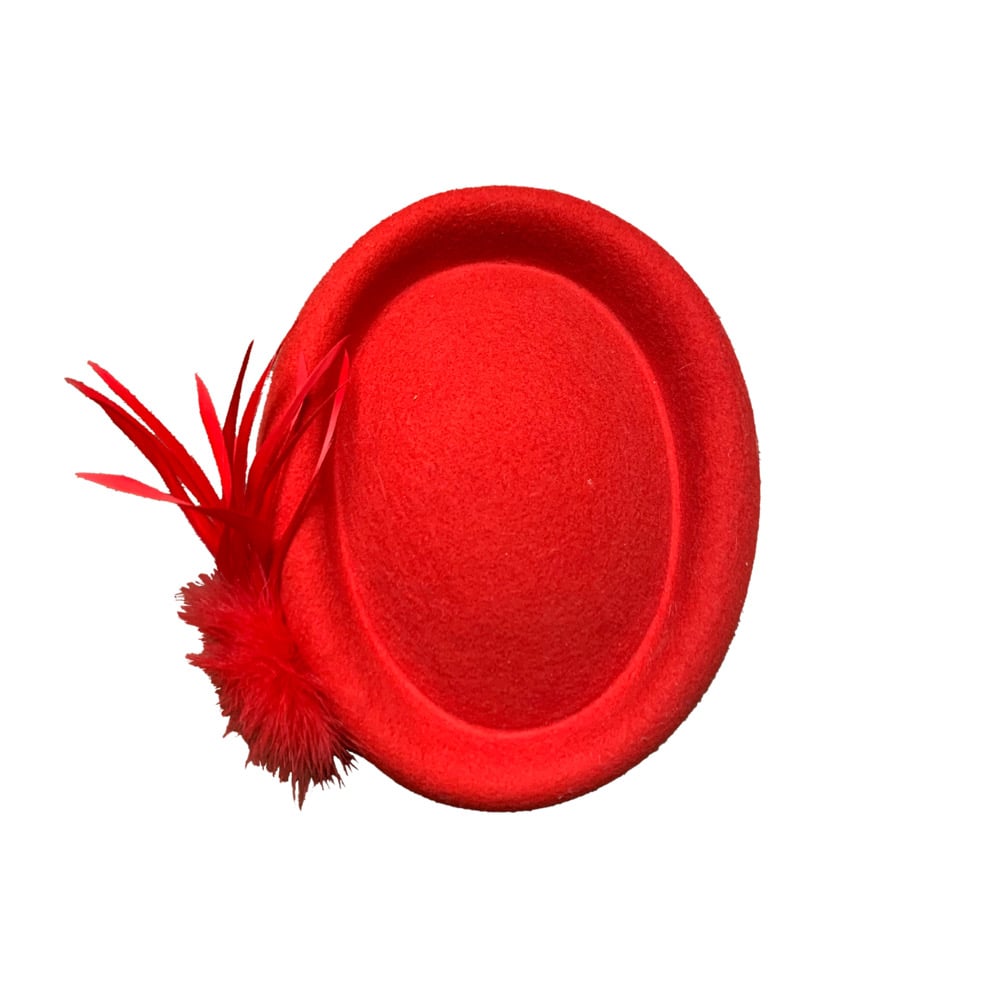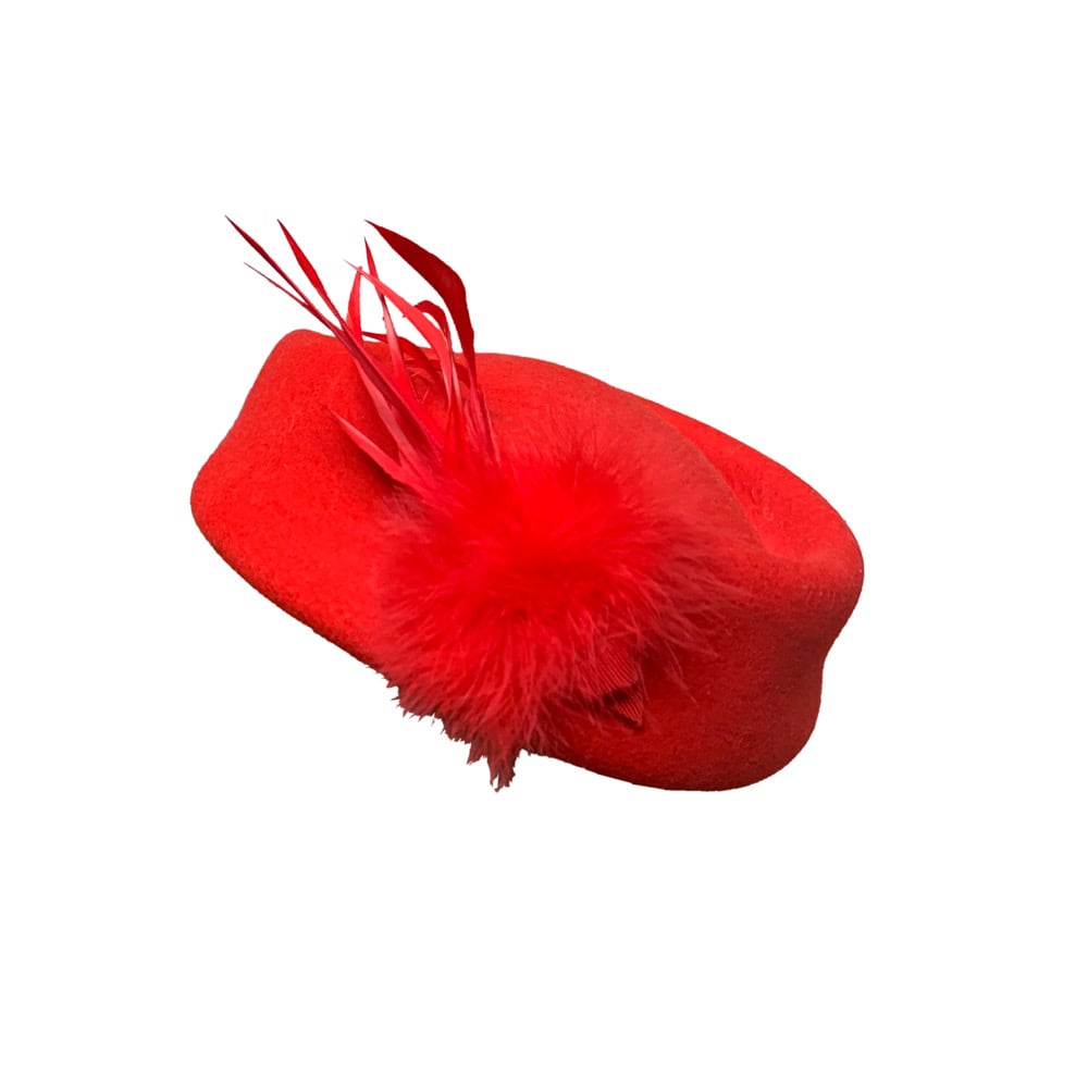 A bright red half hat with red feathers and fur.